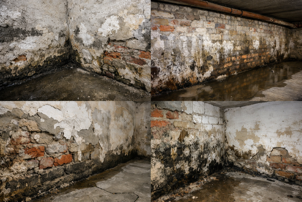 - Dégradations du mortier/béton, salpêtre, suintements, moisissures